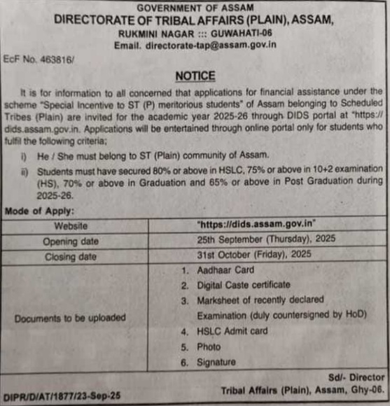 The Government of Assam, Directorate of Tribal Affairs (Plain), has announced the Special Incentive to ST (P) Meritorious Students scheme for the academic year 2025-26. This initiative aims to provide financial assistance to bright students belonging to the Scheduled Tribes (Plain) community of Assam.